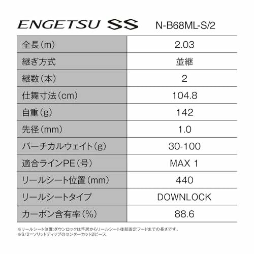 全長:6フィート8インチ (2.03m) / 継ぎ方式:並継 / 継数(本):2 / 仕舞寸法(cm):104.8