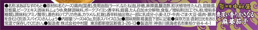 【ソース】鶏肉(国産)、食用油脂(ラード、なたね油)、砂糖、麻辣醤、醸造酢、粒状植物性たん白、甜麺醤、豆板醤、ビーフエキス調味料、しょうゆ、発酵調味料、ポークブイヨン、香辛料、蝦醤、たん白加水分解物、食塩/増粘剤(加工でん粉、増粘多糖類)、調味料(アミノ酸等)、着色料(パプリカ色素、カラメル、紅麹)、香辛料抽出物、(一部に乳成分・小麦・えび・牛肉・ごま・大豆・鶏肉・豚肉を含む) 【別添スパイス】さんしょう