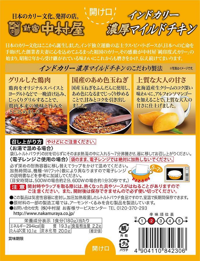 3営業日以内に発送≪新品未開封品≫鶏肉をヨーグルト、特製カレー粉に漬け込み、オーブンで焼き上げることでうま味を閉じ込めました。あめ色になるまで炒めた玉ねぎを使用することで野菜の甘みを出し、カスリメティやアルフォンソマンゴー等を加えて、上質な大人の味わいの甘口チキンカリーに仕上げました。インドカリーシリーズ初の甘口タイプです。