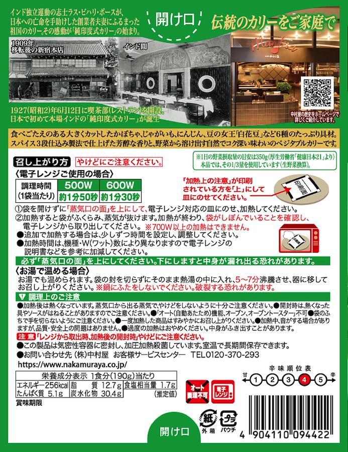 食べごたえのある大きくカットしたかぼちゃ、じゃがいも、にんじん、豆の女王「白花豆」など6種のたっぷり具材。スパイス3段仕込み製法で仕上げた芳醇な香リと、野菜から溶け出す自然で濃厚な甘みと旨みがコク深いベジタブルカリーです。レンジ調理できるようになりました。【重要】メーカーによる商品リニューアルに伴いパッケージ(内容量も含む)変更が行われた場合、新パッケージでお届け致します事ご了承願います。