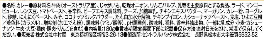 牛肉(オーストラリア産)、じゃがいも、乾燥オニオン、りんごパルプ、乳等を主要原料とする食品、ラード、マンゴーピューレ、レンズ豆、トマトペースト、香辛料、ビーフエキス調味料、チーズ、加糖練乳、チキンエキスパウダー、マーガリン、カレー粉、ヨーグルト、砂糖、にんにくペースト、みそ、ココナッツミルクパウダー、たん白加水分解物、チキンブイヨン、カシューナッツペースト、食塩、ひよこ豆粉/着色料(カラメル)、増粘剤(加工でん粉)、調味料(アミノ酸等)、pH調整剤、酸味料、香料、香辛料抽出物、(一部に乳成分・小麦・カシューナッツ・牛肉・大豆・鶏肉・豚肉・りんごを含む)