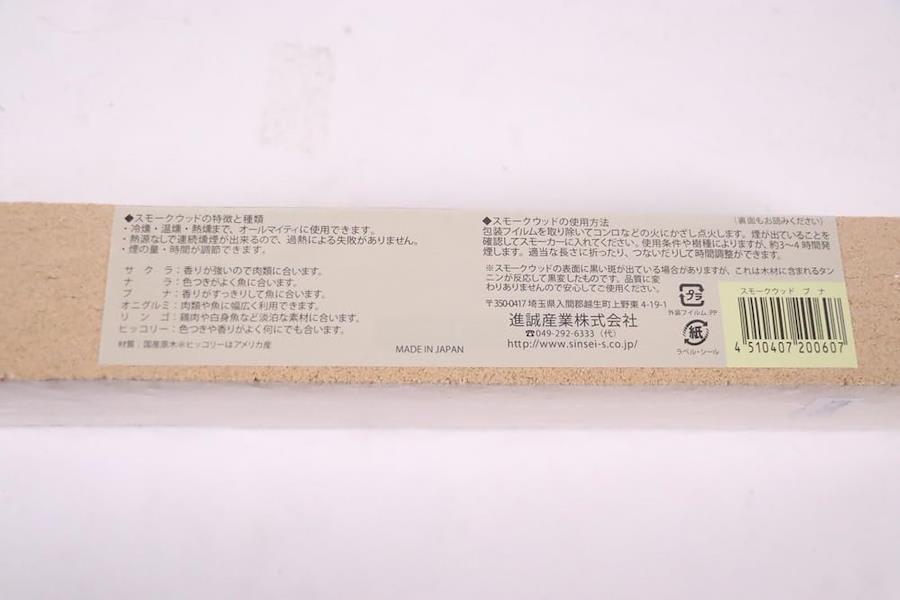燻煙材容量 : 220g常温で1本あたり約4時間煙を出し続けます。ただし種類や使用条件によって燃焼時間は前後します。ブナナラと同様に色つきがいいので魚に合います。ヨーロッパではハムやソーセージなど肉類にも多く使われています。