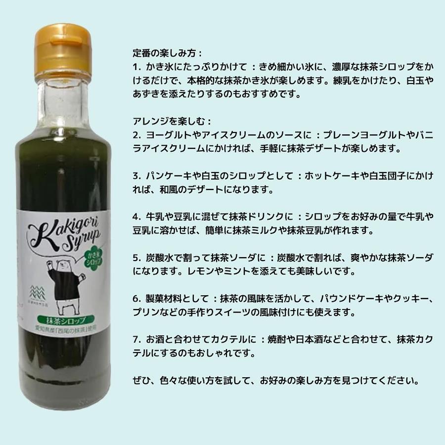 愛知・西尾の抹茶を使用。豊かな香りとコク、てんさい糖の優しい甘さが特徴。着色料、香料、酸化防止剤などの添加物は使用していません。かき氷のシロップとしては、シロップ1:かき氷4が目安です。その他にも、お好みの量でヨーグルトやパンケーキのソース、炭酸やカクテルなどの飲み物に混ぜても楽しめます。おすすめの使い方をご紹介します。抹茶の風味を活かして、色々楽しめますよ。【免責事項】メーカーによる商品リニューアルに伴いパッケージ(内容量も含む)変更が行われた場合、新パッケージでお届け致します事ご了承願います。