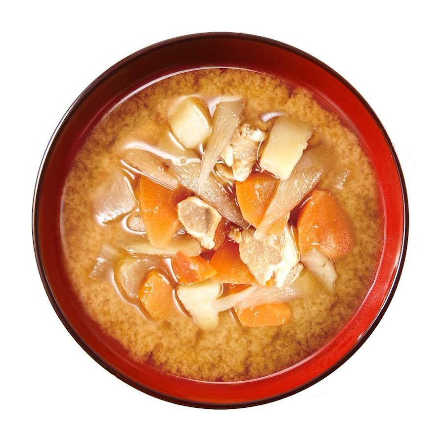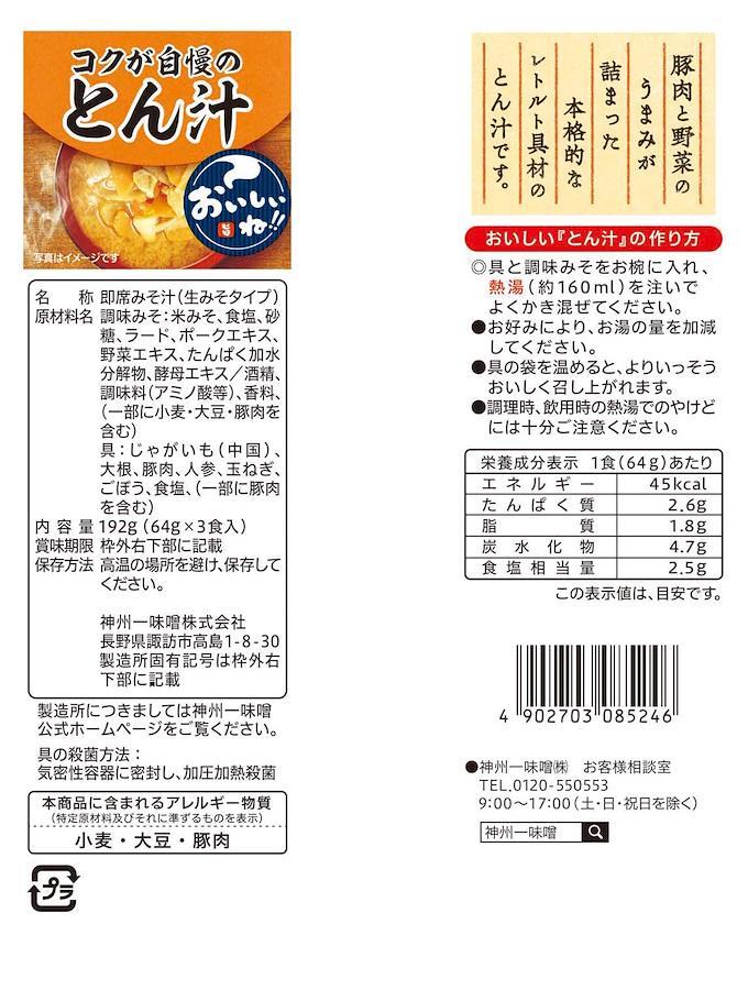 調味みそ:米みそ、食塩、砂糖、ラード、ポークエキス、野菜エキス、たんぱく加水分解物、酵母エキス/酒精、調味料(アミノ酸等)、香料、(一部に小麦・大豆・豚肉を含む)具:じゃがいも(中国)、大根、豚肉、人参、玉ねぎ、ごぼう、食塩、(一部に豚肉を含む)
