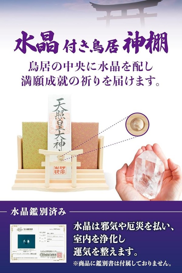 壁掛け設計で飾り場所に困らない神聖な水晶鳥居付きモダンな神棚 ( お札立て )。