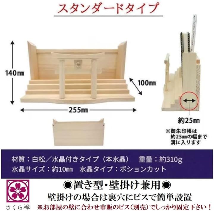 「スペック」神棚素材:天然白松作り 水晶(半球10mm) サイズ:(約)縦14cmx横25.5cmx奥行10cm 重量:約310g *お届け時に箱から出してすぐにお祀りいただける完成品。