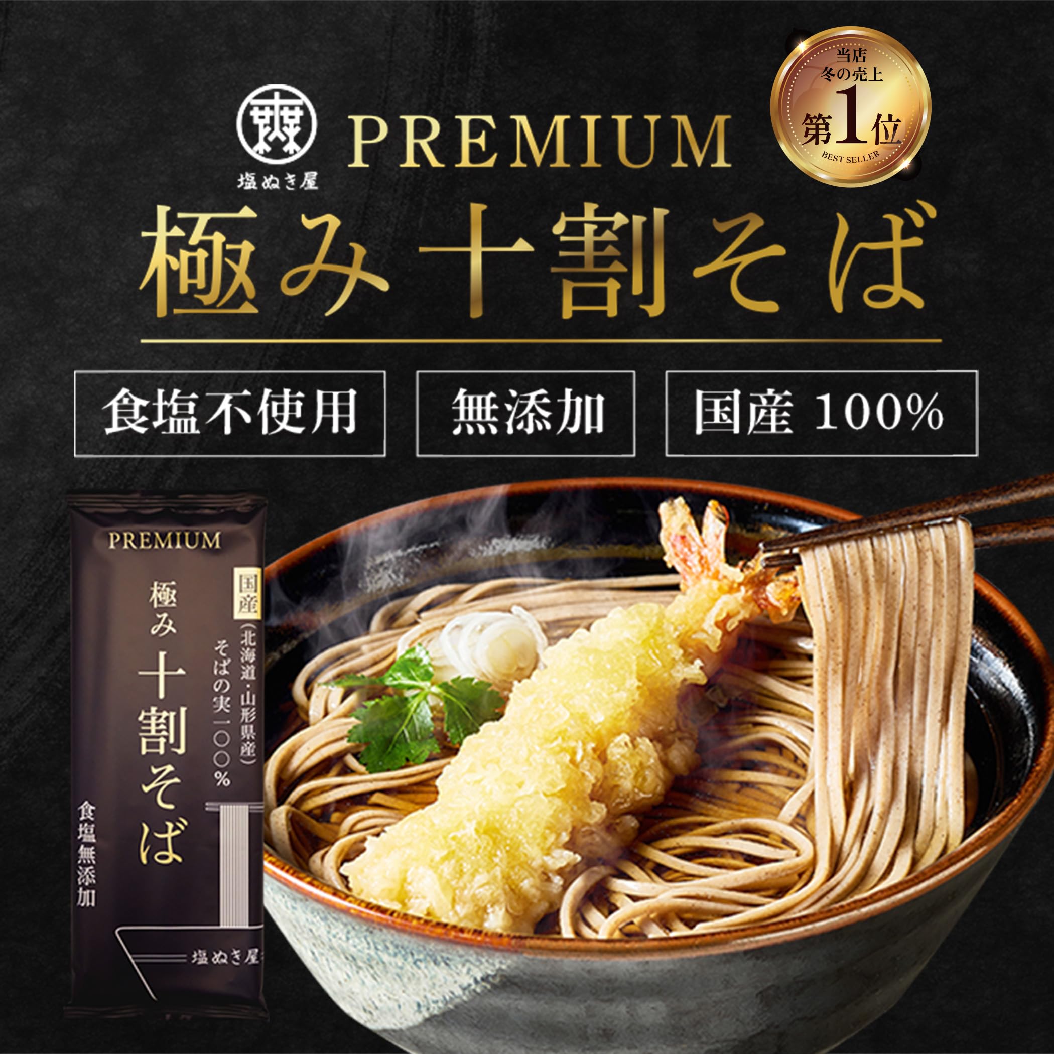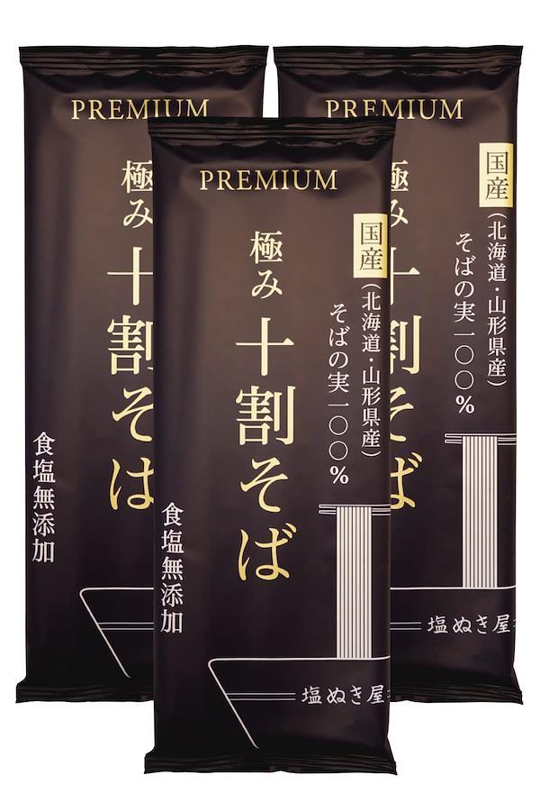 3営業日以内に発送≪新品未開封品≫【年越しそばにもおすすめ】塩ぬき屋 食塩無添加 極み 十割そば 国産100% 3袋セット 年越し蕎麦にも国産そばの実100%(北海道・山形県)のこだわり蕎麦。小麦粉等のつなぎは一切不使用の「十割そば」です。【注意】十割そばは、一般的な小麦粉の入ったそばとは食感や風味が全く違います。【十割そばと一般的なそばの違い】「十割そば」は、蕎麦粉のざらっとした舌触りで食べ応えがあり、ぷっつりと切れた麺から蕎麦の芳醇な香りが口いっぱいに広がります。(麺は切れやすいです)。対して小麦粉を入れた「一般的なそば」は、切れにくくツルッとした食感です。そばの種類の違いをご確認頂き、ご検討ください。十割そばは、食塩不使用なので、減塩してる方にもおすすめです。 (一般的なそばには食塩が含まれます)こだわりの「石挽き」と「ロール挽き」のそば粉をブレンドしました。しっとりして香りと風味に優れた「石臼挽き」と、1番粉から3番粉まで挽き分けができるロール挽きのそば粉をブレンドし、こだわりの食感と香りを実現。本品は、そばの実の中心の一番粉から三番粉・甘皮までを使った究極のお蕎麦です。そばの実を全て使っているため、香りや栄養価が高いのが特徴です。十割蕎麦だから蕎麦の香りが口いっぱいに広がります。無添加・長野県で国内製造だから安全・安心。*小麦粉を使用していない為、そばが切れやすいので、調理する際にご注意ください。水の分量や茹で時間などによって味や食感が変わりますので、ご注意ください。【年越しそばに】年越しそばには十割蕎麦が良いとされています。「十割蕎麦は切れやすいことから、一年間の苦労を翌年に持ち越さないように」と言う意味です。【重要】メーカーによる商品リニューアルに伴いパッケージ(内容量も含む)変更が行われた場合、新パッケージでお届け致します事ご了承願います。
