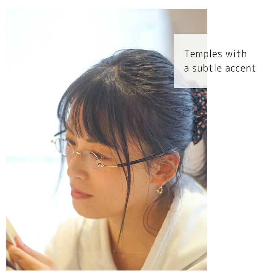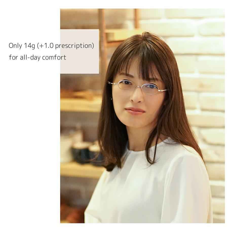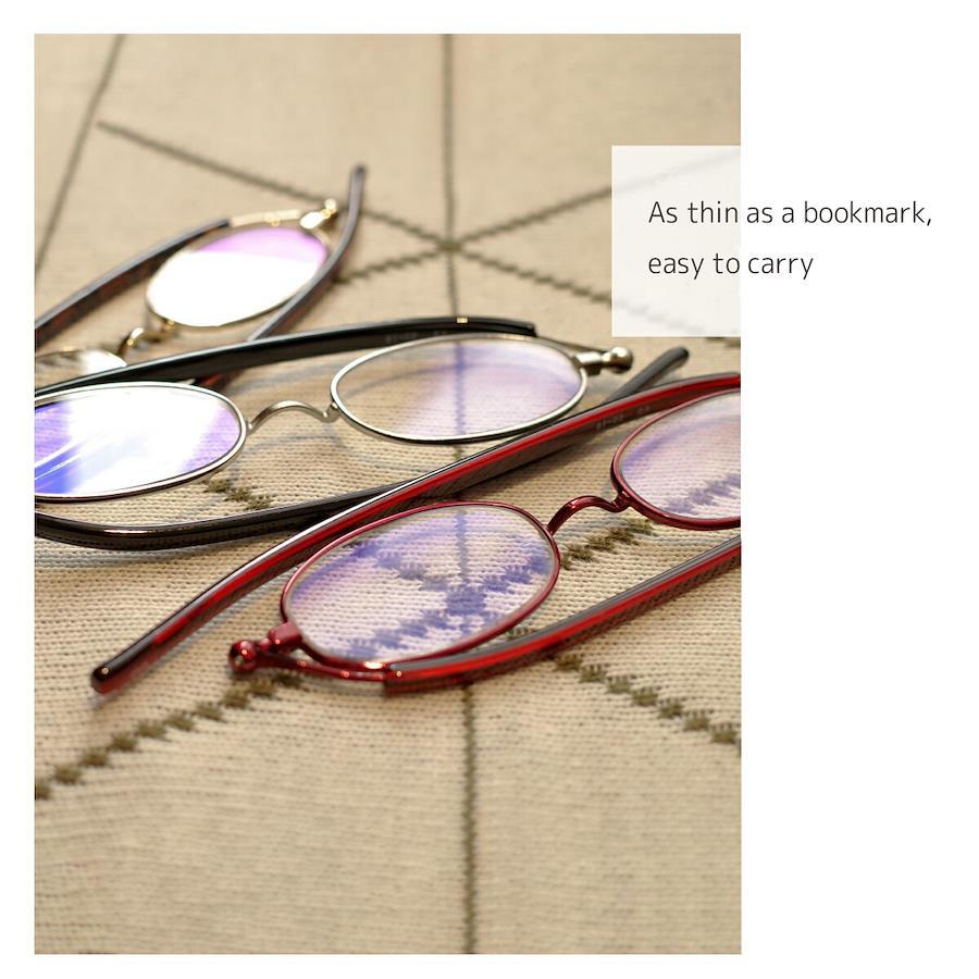 ファッション性とグッズとしての美しさを備えたメガネフレームを支えるのは、テンプルを斜め方向に開閉させる特許取得の特殊丁番 (特許6096096)。メガネの聖地福井県鯖江市の老舗眼鏡メーカーが企画デザインした逸品シニアグラス。まさに栞のような薄さです。
