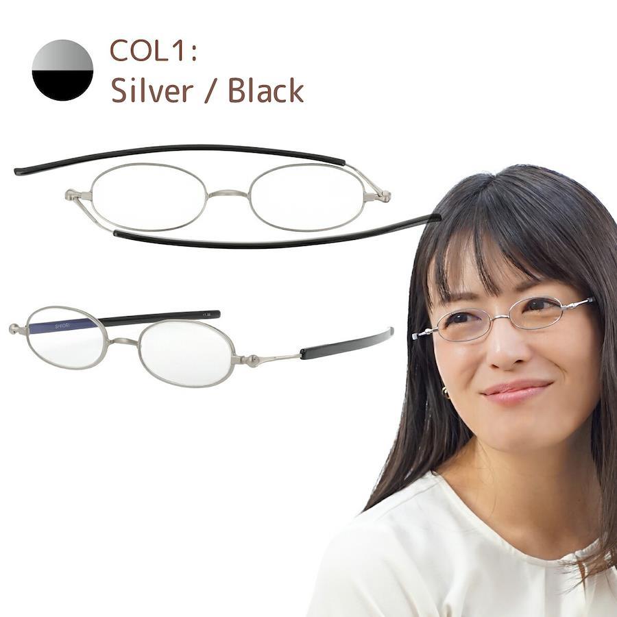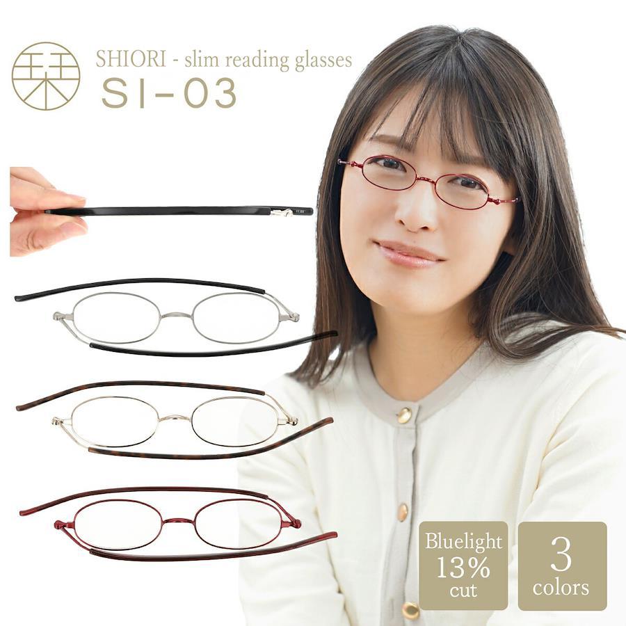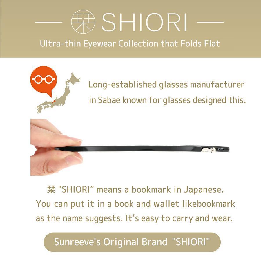 男性、女性共用。オシャレな携帯老眼鏡SHIORIのセルテンプルタイプ。ブルーライトカット仕様。折りたたみ時に、セルテンプルの厚みによりレンズを傷つけることがありません。