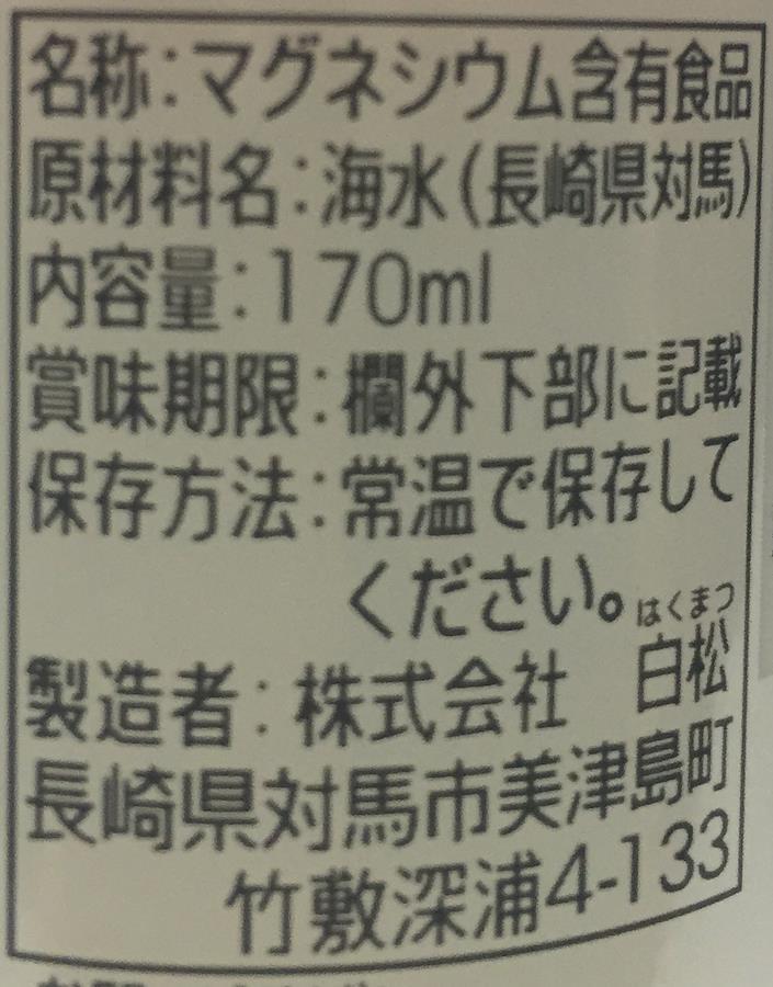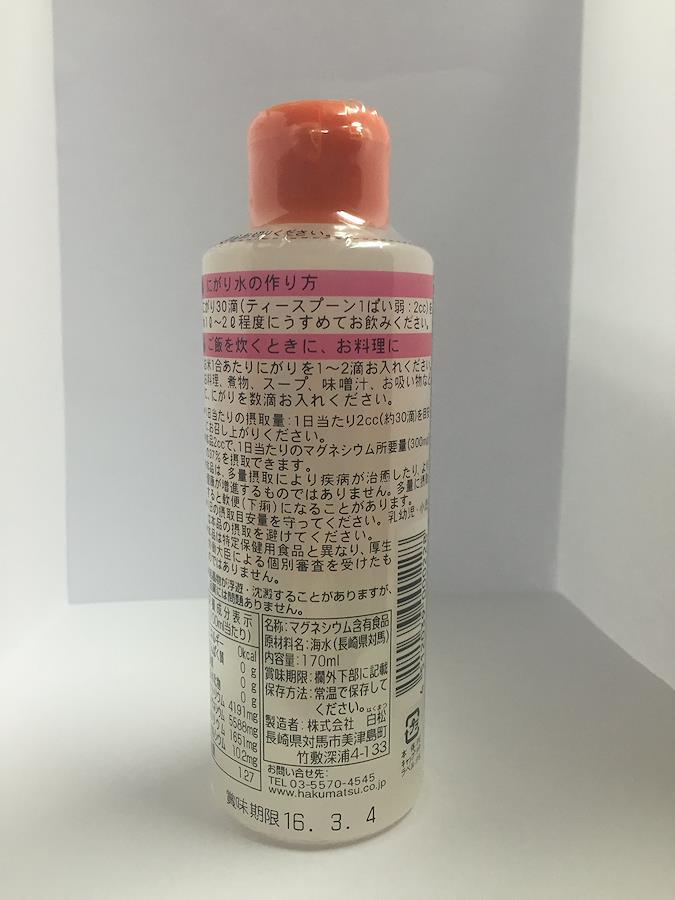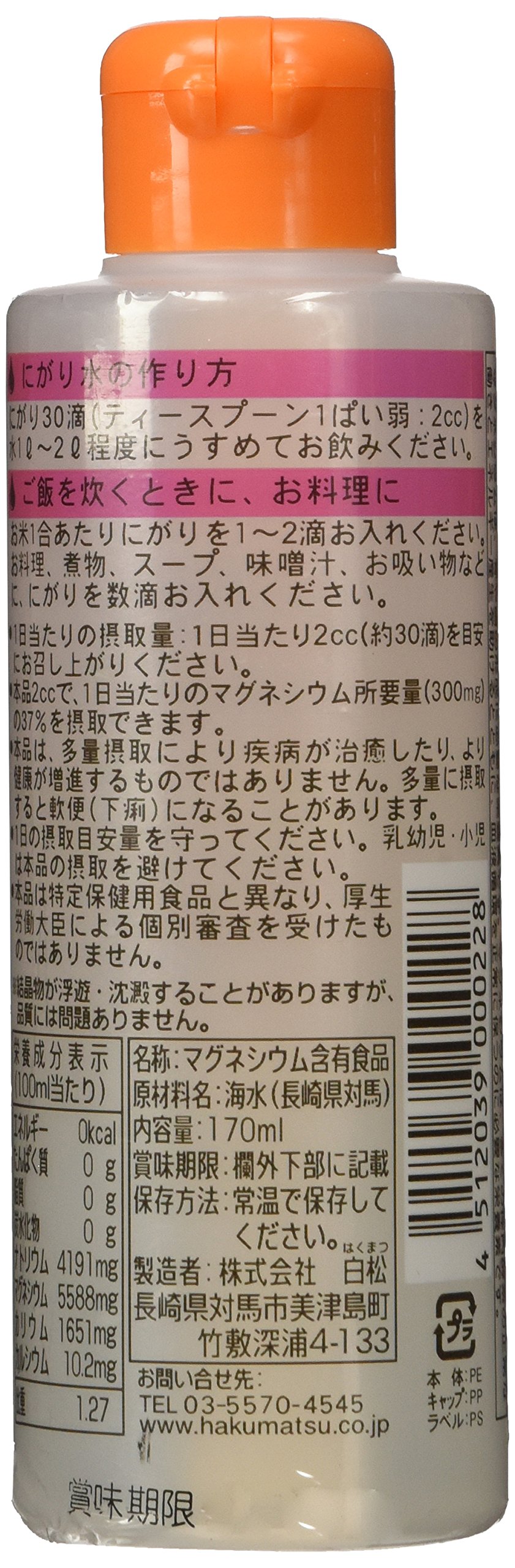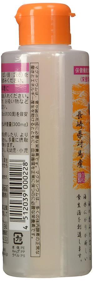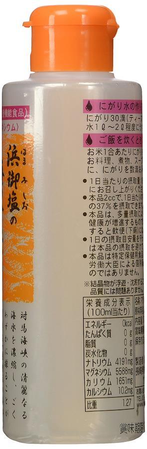 ◆「浜御塩」を作る際、ごく僅かに採れるにがりです。 「浜御塩の海水にがり」は、長崎県対馬の清麗なる海水を塩職人が平釜で煮詰めて浜御塩を作る際に、取れた海水にがりです。 ◆旨味のあるマグネシウム含有食品です。保健機能食品(栄養機能食品)栄養素:マグネシウム マグネシウムは、骨や歯の形成に必要な栄養素です。マグネシウムは、多くの体内酵素の正常な働きとエネルギー産生を助けるとともに、血液循環を正常に保つのに必要な栄養素です。 マグネシウムの補給として、以下の方法でご使用ください。 ◎にがり水の作り方 浜御塩の海水にがりを30滴(ティースプーン1ぱい弱:約2cc)を水1リットル~2リットル程度に薄めてお飲みください。 ◎ご飯を炊くときに 1合あたり1~2滴入れて、お炊きください。 ご飯が、ふっくらして美味しく召し上がっていただけます! ご飯を研ぐ際、海水にがりを入れた水で研ぐのも、まさに隠し技。弾力ある、甘くておいしいご飯を実感していただけると思います。 ◎お料理に お料理、煮物、スープ、味噌汁、お吸い物などに数滴入れてください。