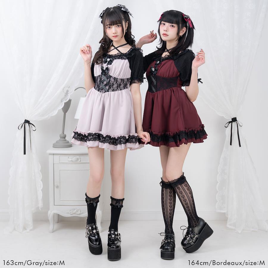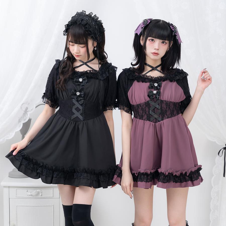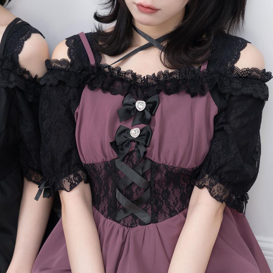 2wayかわいいコルセット風レースたっぷりワンピース【デザイン】オフショルにもなれる2wayワンピースになります袖部分はレースとシーフォーで少し肌見えるのがかわいい襟部分のリボンボウタイはチョーカーになれるのもポイントウエスト部分レース重ねでコルセット風でかわいい身頃ハートビジュー付きリボンが取り外し可能【素材】しっかりとした素材になっております。本体に裏地がついています。【コーディネート】闇系、地雷系コーデにおすすめのかわいいワンピース参戦服にもオススメです《透け感》なし 《生地の厚さ》普通 《裏地》あり《生産国》中国