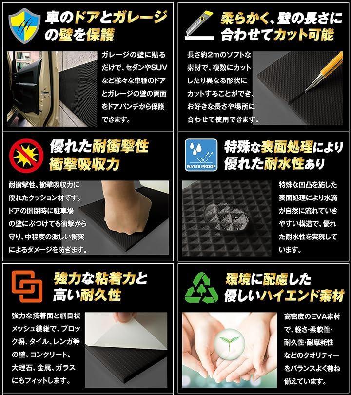 「厚さ 9mmの高密度 衝撃吸収材」この駐車場 クッションは車庫の壁に貼るだけで様々な車種のドアをドアパンチから保護します。