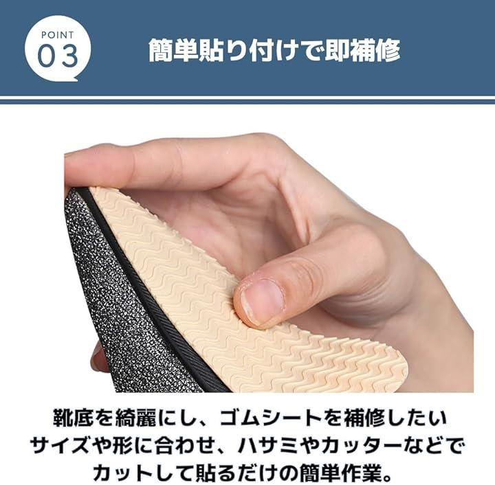 「簡単貼り付けで即補修」靴底を綺麗にし、ゴムシートを補修したいサイズや形に合わせ、ハサミやカッターなどでカットして貼るだけの簡単作業。