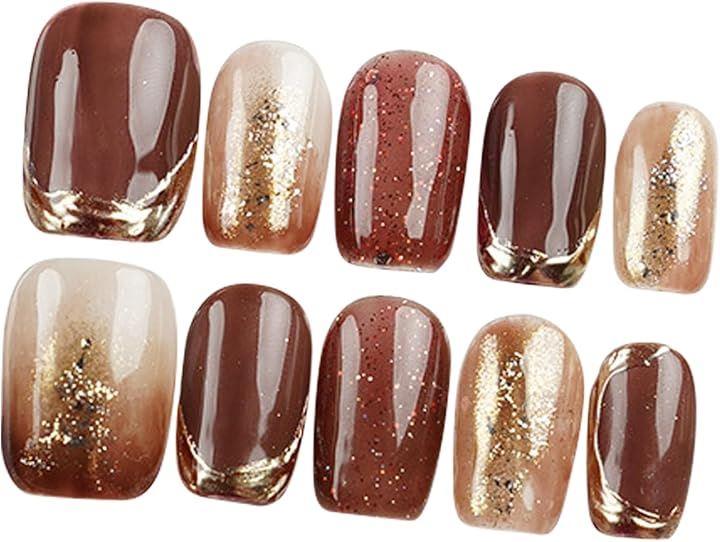 「ブラウン味がかったレッドxゴールドのネイル」艶がきれいなバーガンディ系レッドを基調に、ゴールドのラメとフレンチネイルが、より高級感のあるネイルチップ。