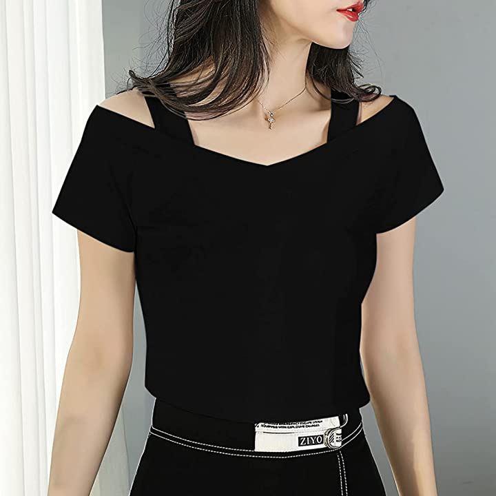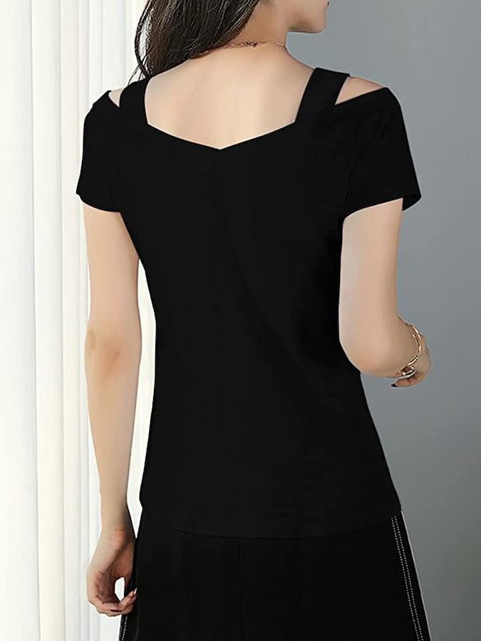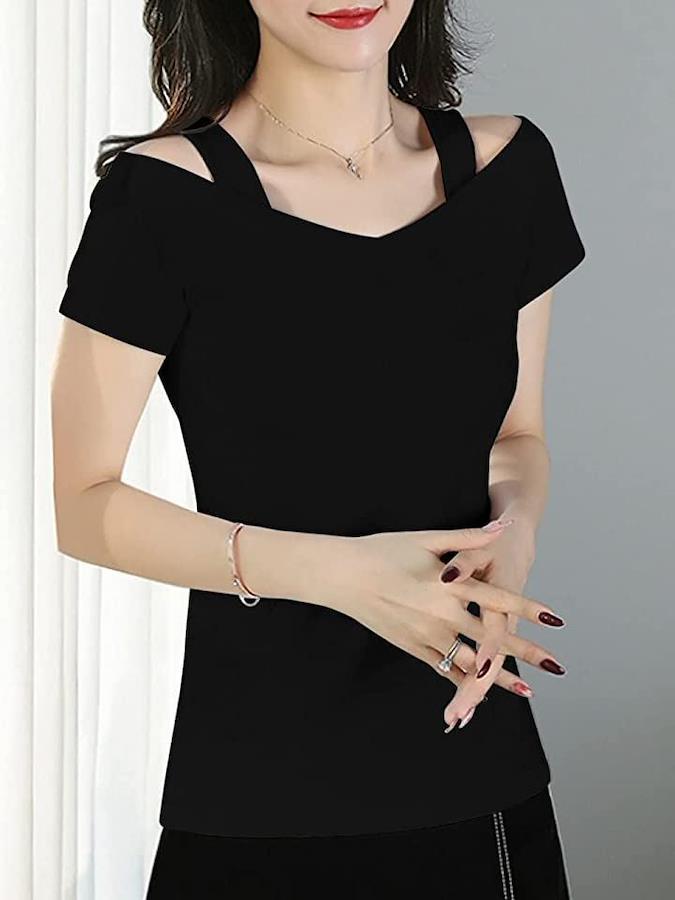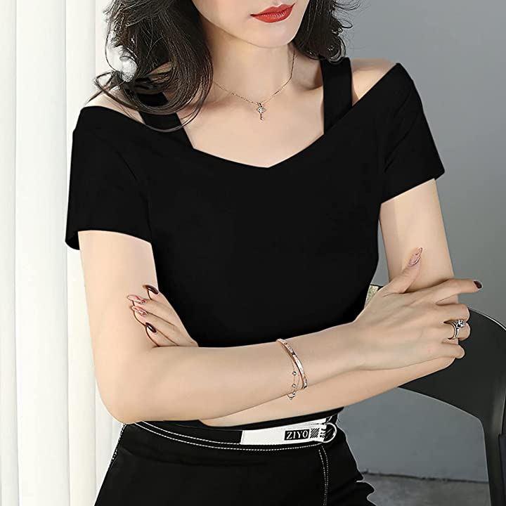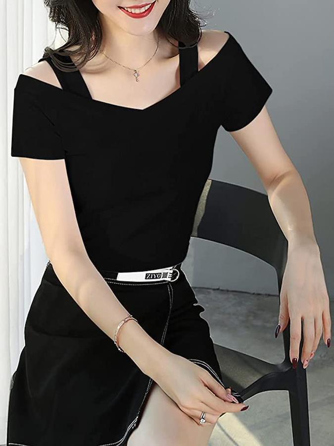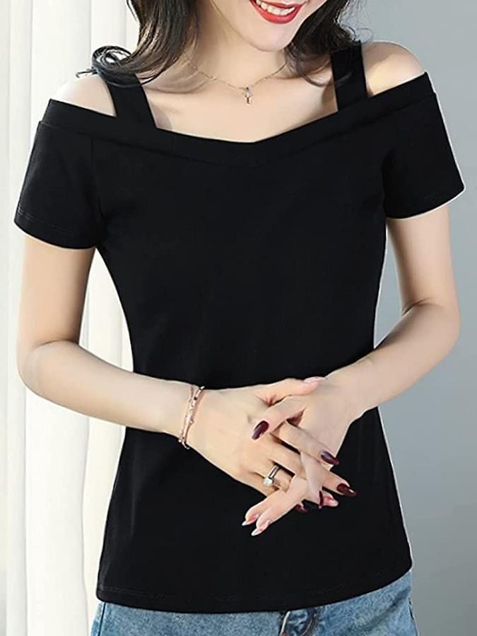 個性的なネックラインとオープンショルダーが特徴的なTシャツ。