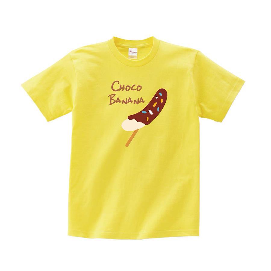 チョコバナナのポップなイラストデザインTシャツです。※画像ははめ込み画像となり、実際とは多少異なりますので予めご了承ください。 ※サイズ表をよくご確認の上ご購入ください。 ※受注生産となるため、返品、交換はご遠慮ください。