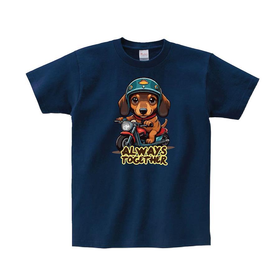 ダックスフントのバイク乗りのかわいいデザインTシャツです。※画像ははめ込み画像となり、実際とは多少異なりますので予めご了承ください。 ※サイズ表をよくご確認の上ご購入ください。 ※受注生産となるため、返品、交換はご遠慮ください。