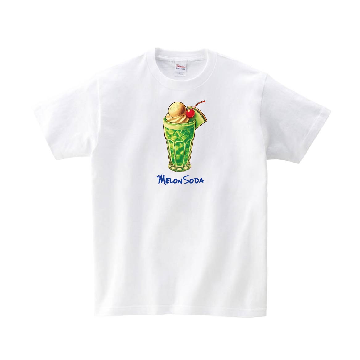 レトロな昭和感のあるメロンソーダのイラストデザインTシャツです。※画像ははめ込み画像となり、実際とは多少異なりますので予めご了承ください。 ※サイズ表をよくご確認の上ご購入ください。 ※受注生産となるため、返品、交換はご遠慮ください。