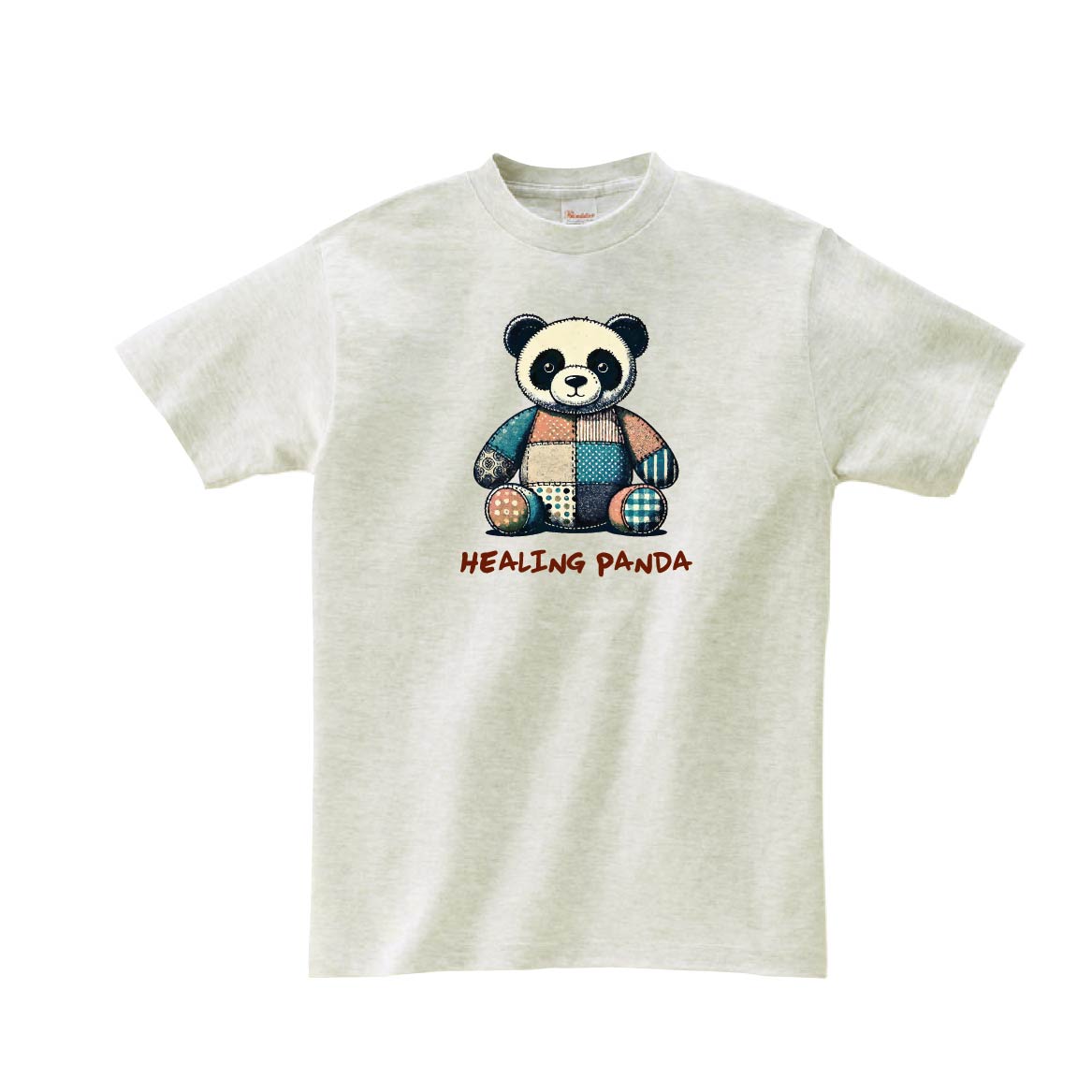 パッチワークのパンダさん。レトロ感のあるかわいいイラストデザインTシャツです。※画像ははめ込み画像となり、実際とは多少異なりますので予めご了承ください。 ※サイズ表をよくご確認の上ご購入ください。 ※受注生産となるため、返品、交換はご遠慮ください。