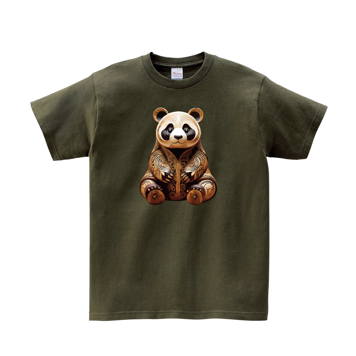 お土産っぽい木彫りのパンダのTシャツです。※画像ははめ込み画像となり、実際とは多少異なりますので予めご了承ください。 ※サイズ表をよくご確認の上ご購入ください。 ※受注生産となるため、返品、交換はご遠慮ください。