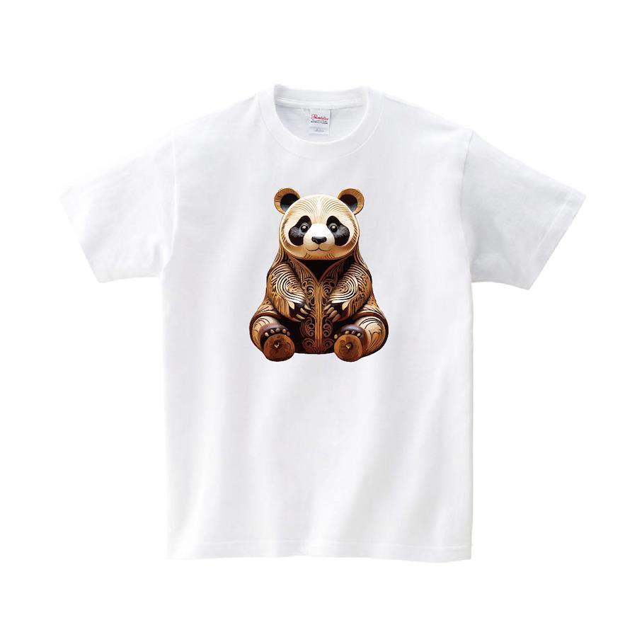 お土産っぽい木彫りのパンダのTシャツです。※画像ははめ込み画像となり、実際とは多少異なりますので予めご了承ください。 ※サイズ表をよくご確認の上ご購入ください。 ※受注生産となるため、返品、交換はご遠慮ください。
