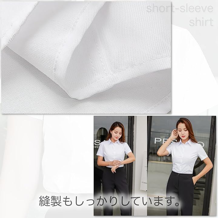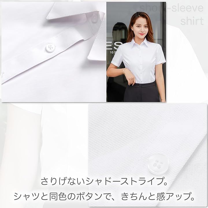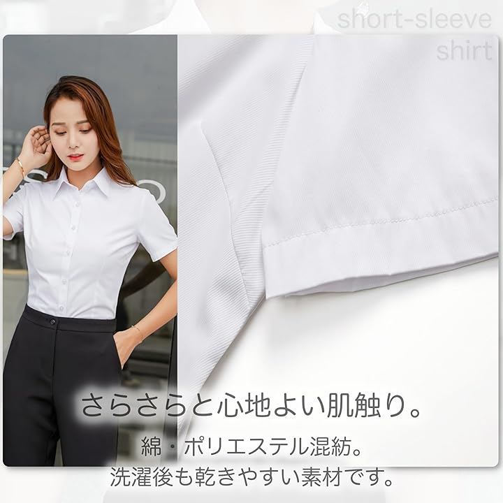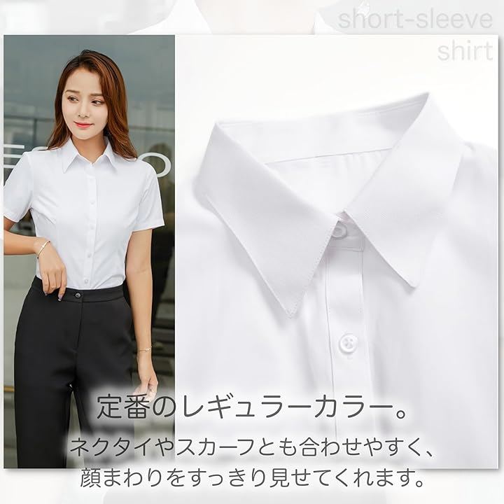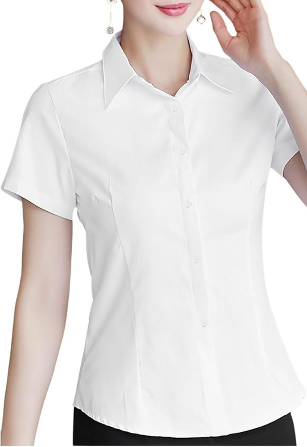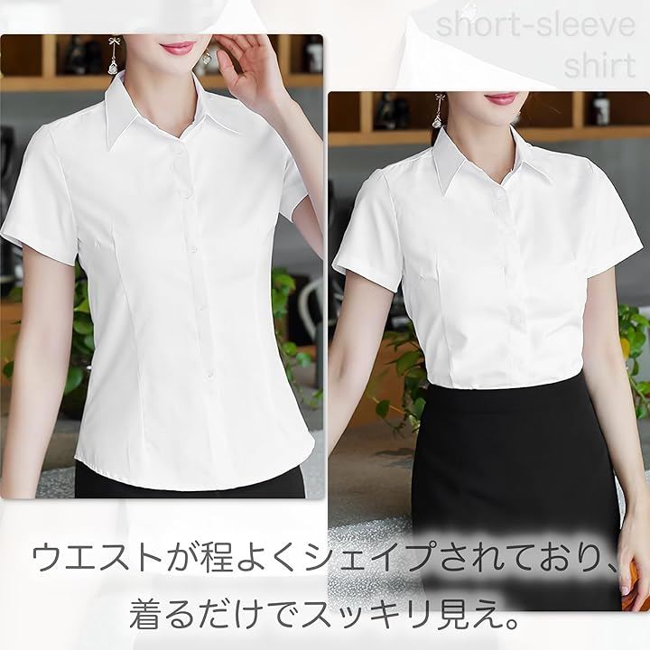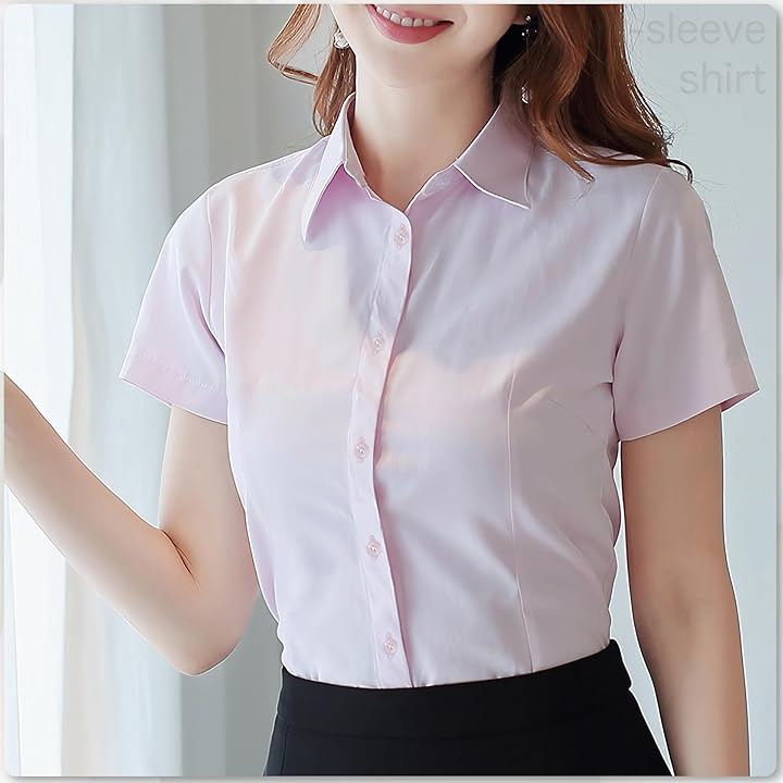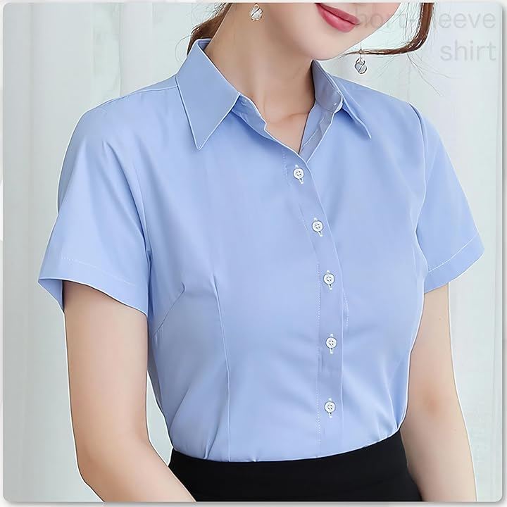 Short-sleeved plain shirt, waist-shaping, round cut, regular collar, women's clothing, spring, summer, autumn, winter, blouse, top, wide cut, office, casual, button, simple, solid color.