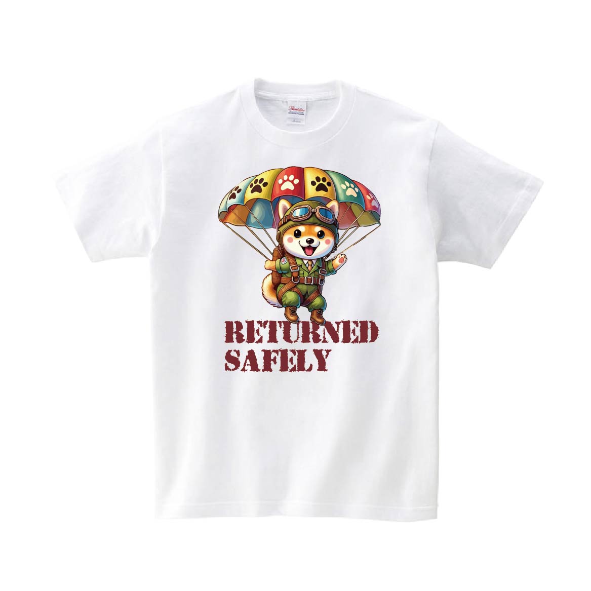 かわいらしい柴犬がパラシュートで無事に帰還したイラストをあしらったデザインTシャツです。※画像ははめ込み画像となり、実際とは多少異なりますので予めご了承ください。 ※サイズ表をよくご確認の上ご購入ください。 ※受注生産となるため、返品、交換はご遠慮ください。