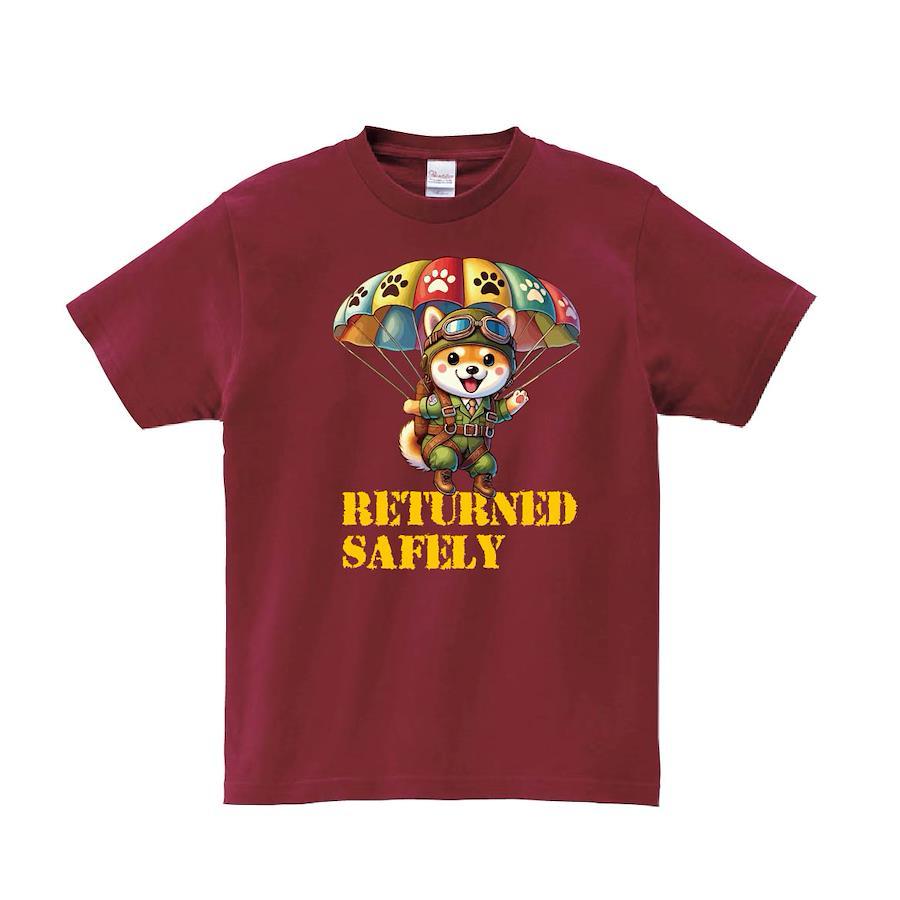 かわいらしい柴犬がパラシュートで無事に帰還したイラストをあしらったデザインTシャツです。※画像ははめ込み画像となり、実際とは多少異なりますので予めご了承ください。 ※サイズ表をよくご確認の上ご購入ください。 ※受注生産となるため、返品、交換はご遠慮ください。
