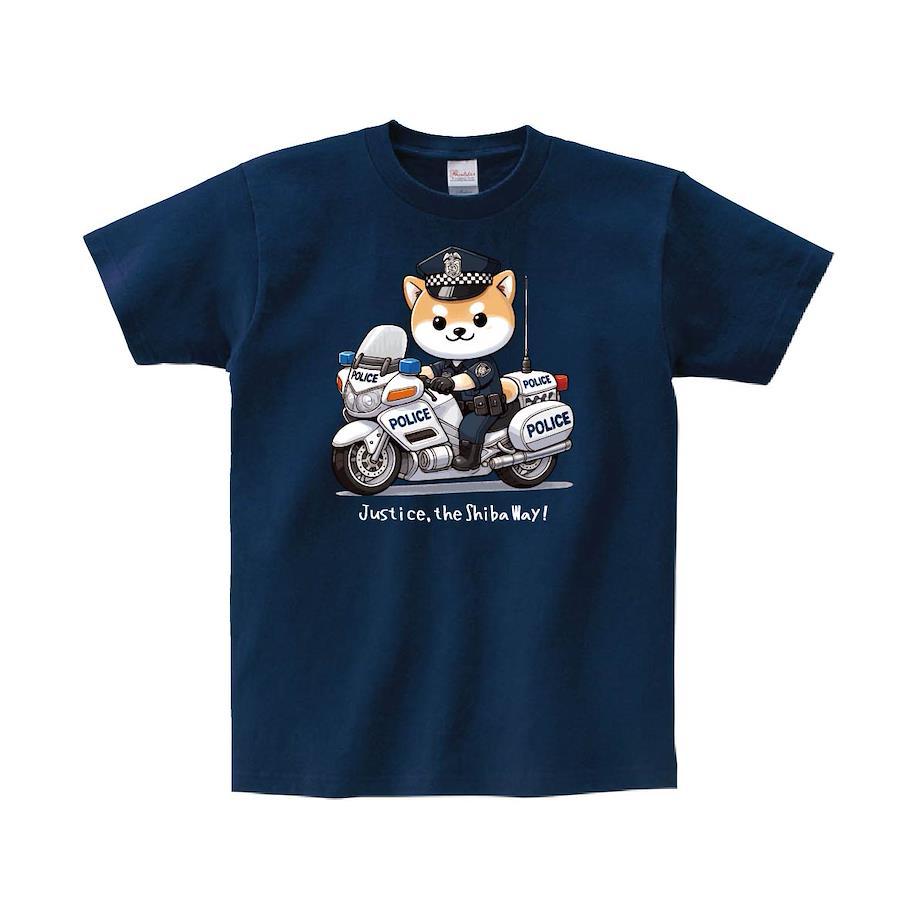 犬のおまわりさん、柴犬の白バイに乗った、かっこつけデザインTシャツです。※画像ははめ込み画像となり、実際とは多少異なりますので予めご了承ください。 ※サイズ表をよくご確認の上ご購入ください。 ※受注生産となるため、返品、交換はご遠慮ください。