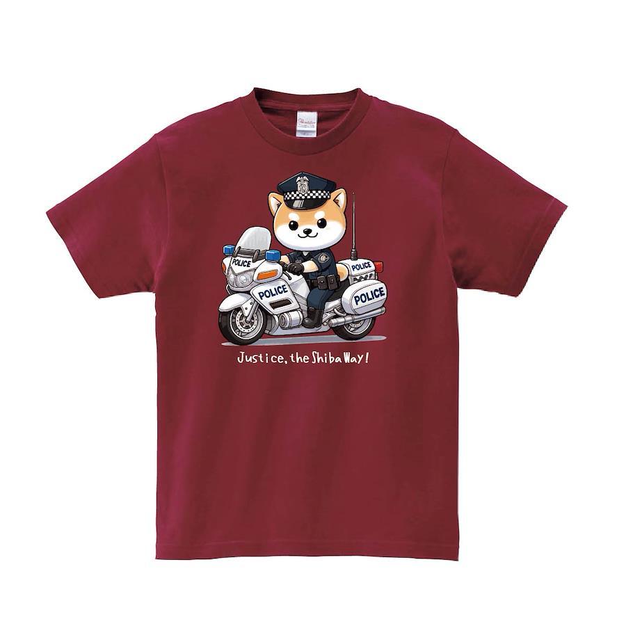 犬のおまわりさん、柴犬の白バイに乗った、かっこつけデザインTシャツです。※画像ははめ込み画像となり、実際とは多少異なりますので予めご了承ください。 ※サイズ表をよくご確認の上ご購入ください。 ※受注生産となるため、返品、交換はご遠慮ください。