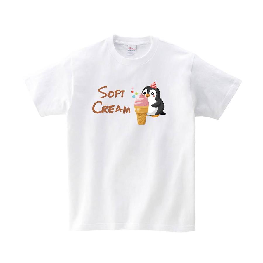 ふんわりいちご味のソフトクリームとペンギンくんのイラストデザインTシャツです。※画像ははめ込み画像となり、実際とは多少異なりますので予めご了承ください。 ※サイズ表をよくご確認の上ご購入ください。 ※受注生産となるため、返品、交換はご遠慮ください。