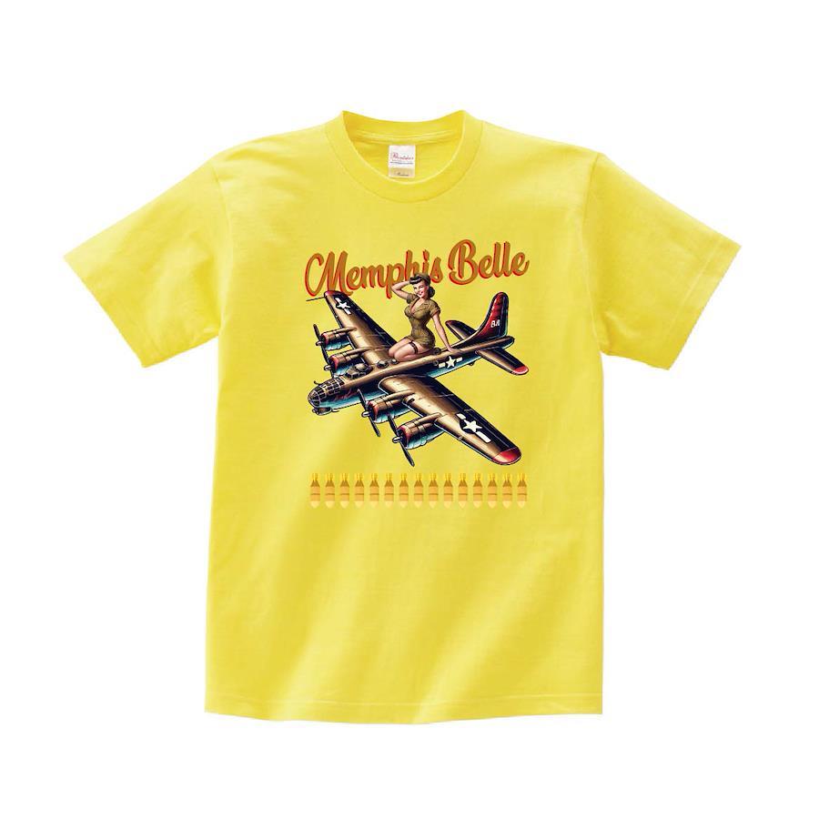 有名な爆撃機、メンフィスベルのビンテージ感のあるデザインTシャツです。※画像ははめ込み画像となり、実際とは多少異なりますので予めご了承ください。 ※サイズ表をよくご確認の上ご購入ください。 ※受注生産となるため、返品、交換はご遠慮ください。