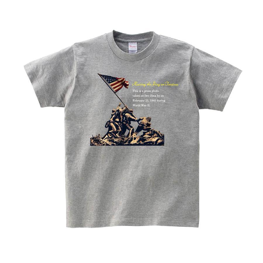 第二次世界大戦中の1945年2月23日に硫黄島で撮影された報道写真のモチーフTシャツです。※画像ははめ込み画像となり、実際とは多少異なりますので予めご了承ください。 ※サイズ表をよくご確認の上ご購入ください。 ※受注生産となるため、返品、交換はご遠慮ください。