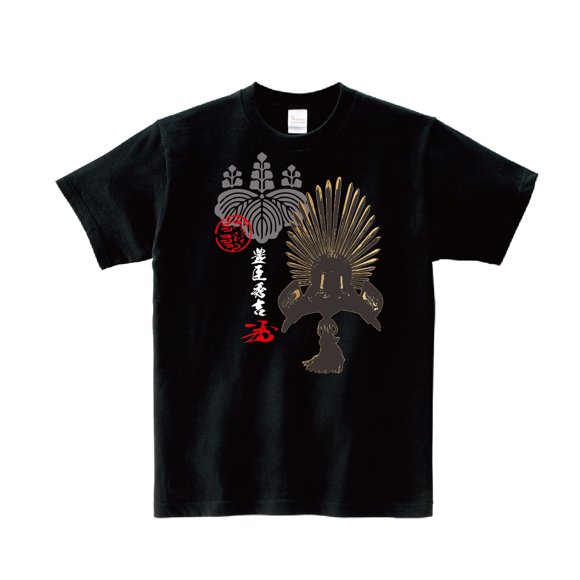 戦国武将の豊臣秀吉、家紋と兜と花押のこだわりTシャツです。 ※画像ははめ込み画像となり、実際とは多少異なりますので予めご了承ください。 ※サイズ表をよくご確認の上ご購入ください。 ※受注生産となるため、返品、交換はご遠慮ください。