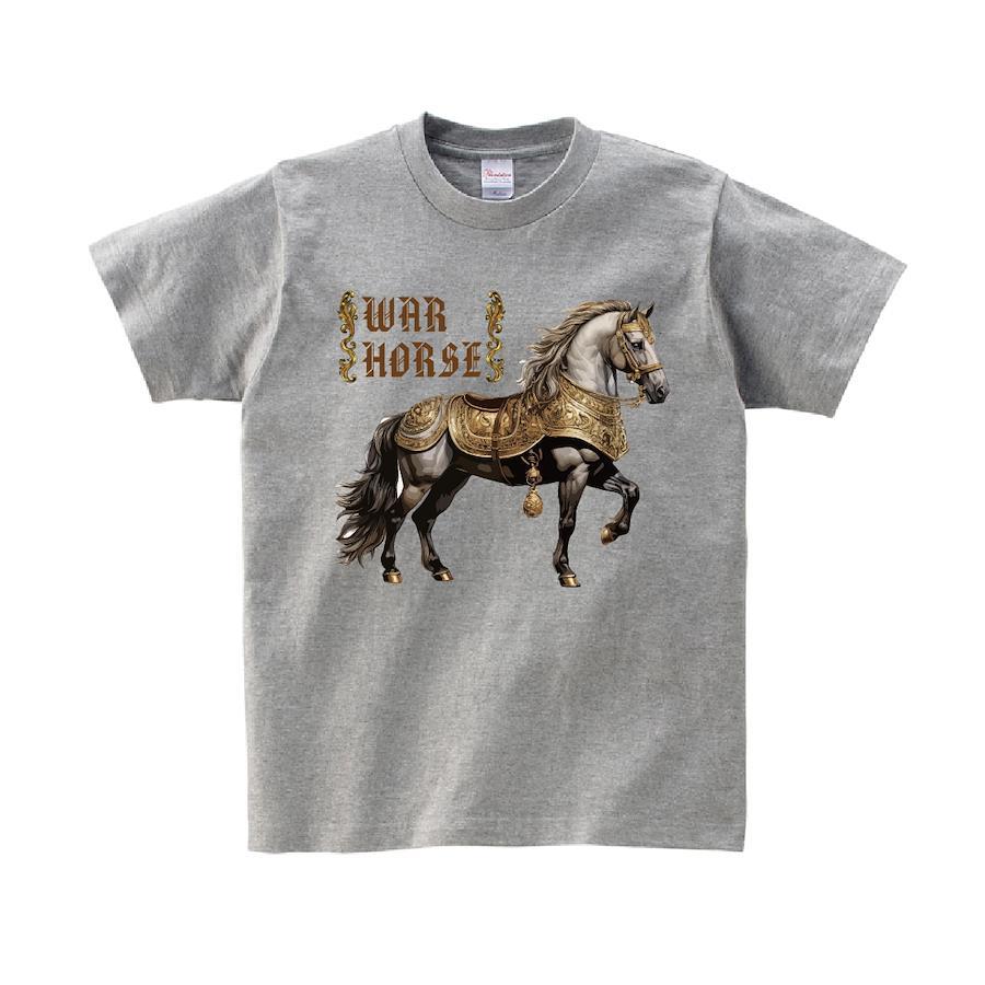 装飾の鞍を背負った軍馬のTシャツです。 ※画像ははめ込み画像となり、実際とは多少異なりますので予めご了承ください。 ※サイズ表をよくご確認の上ご購入ください。 ※受注生産となるため、返品、交換はご遠慮ください。