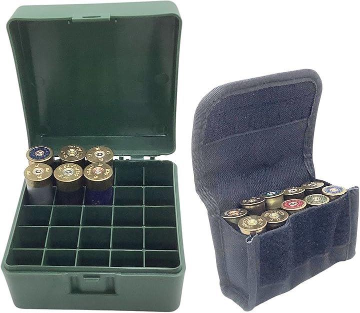 「12番ショットシェル対応の大容量収納セット」本製品は、12番ゲージショットシェルを効率的かつ安全に携行するためのケース(25発収納)とポーチ(10発収納)のセットです。