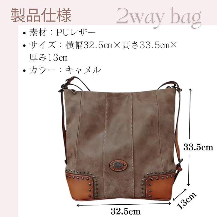「製品仕様」*素材:PUレザー *サイズ:横幅32.5cmx高さ33.5cmx厚み13cm *収納ポケット:ファスナーポケットx3 *カラー:ベージュ キャラメル