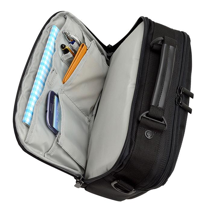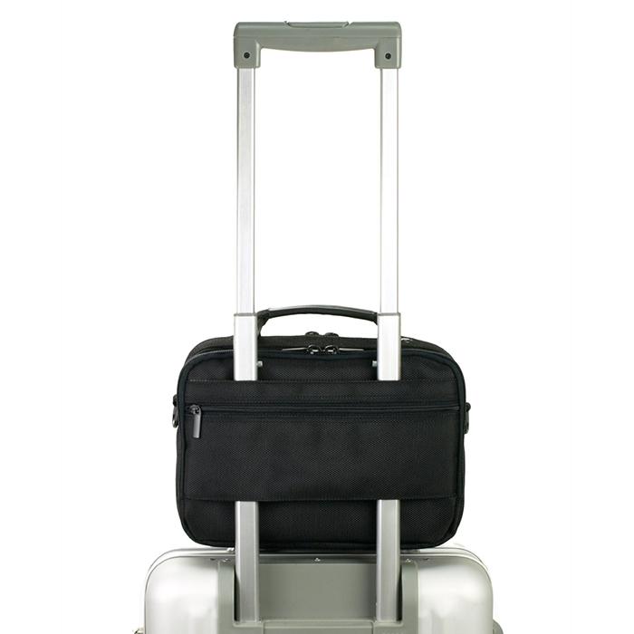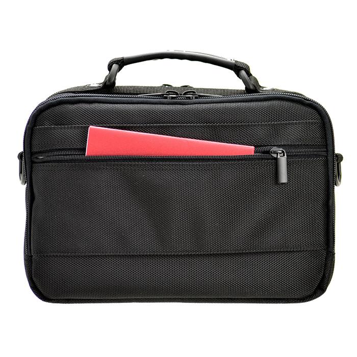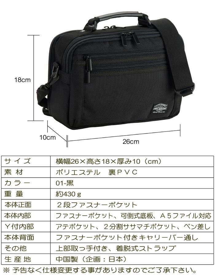 ◆サイズ : 横幅26×高さ18×厚み10センチ◆素 材 : ポリエステル 裏PVC◆カラー : (01)黒◆本体正面 : 2段ファスナーポケット◆本体内部 : ファスナーポケット、A5ファイル収納可能◆Y付内部 : アテポケット、2分割ササマチポケット、ペン差し◆背 面 : ファスナーポケット付きキャリーバー通し◆その他 : 可倒式底板付き、着脱式ショルダーベルト◆重 量 : 約430g◆生産国 : 中国(企画:日本)※「Y付」:本体サイズのアウトポケット※ 予告なく仕様変更する事がありますのでご了承下さい。