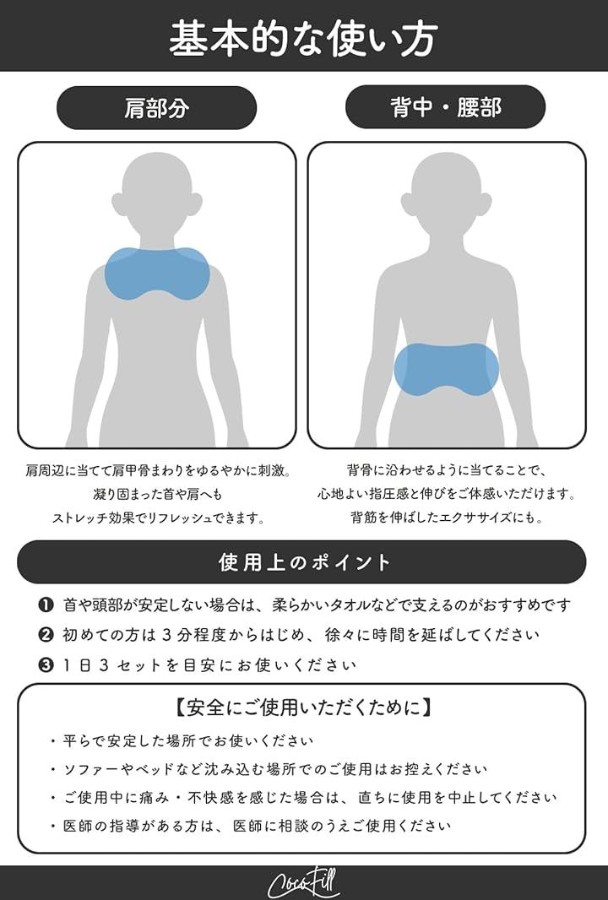 使い方は簡単:肩甲骨の下にピローをセットして仰向けに寝るだけ、1日5分のリラックス習慣で背中のこわばりをじんわりほぐします。