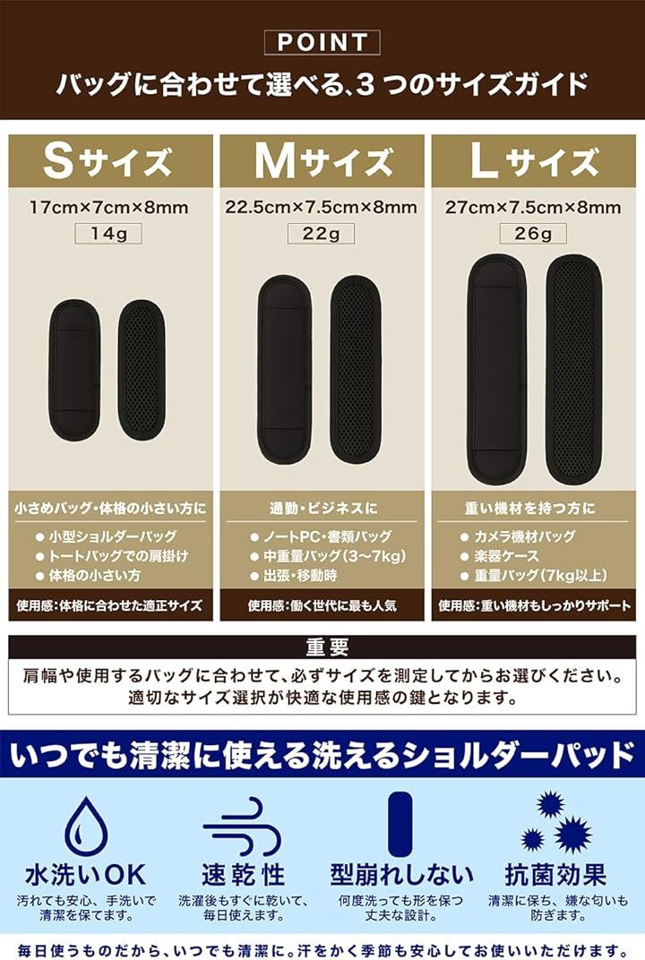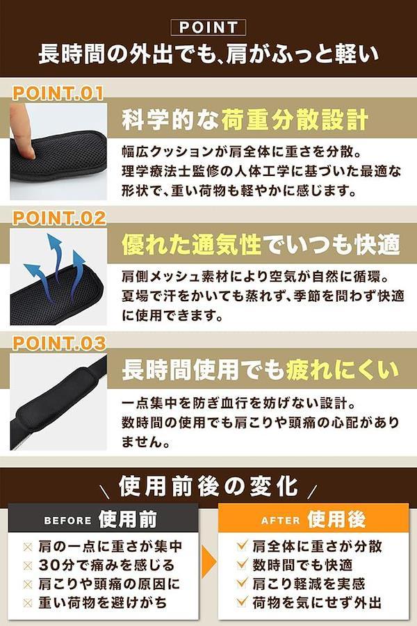 「重さを忘れる肩の軽さ」幅広クッションがベルトの圧力を分散し、重たい荷物でも「ふっと軽くなった」ように感じられます。