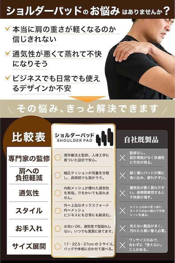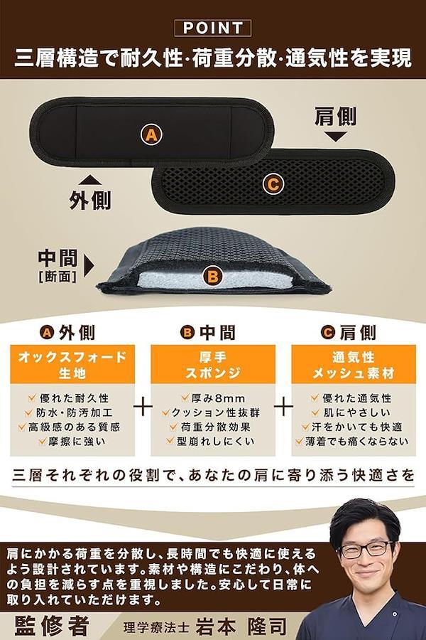 肩にかかる負担を科学的に分散し、長時間の通勤や移動でも「痛みや疲れを感じにくい」使い心地を追求しています。