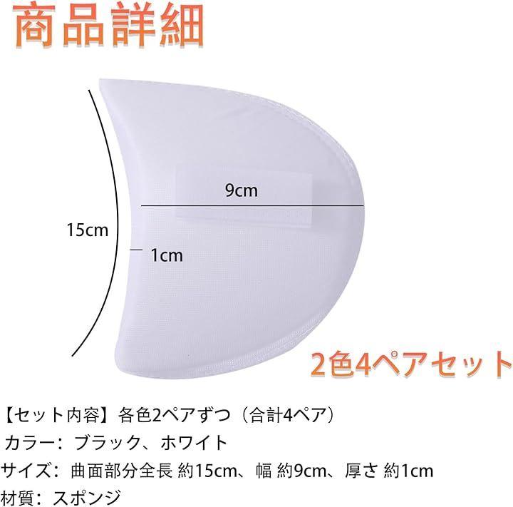 「セット内容」各色2ペアずつ(合計4ペア) カラー:ブラック、ホワイト サイズ:曲面部分全長 約15cm、幅 約9cm、厚さ 約1cm 材質:スポンジ