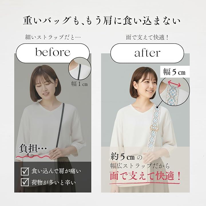 「幅広5cmで肩への負担を激減」 「細いストラップで肩が痛い…」そんな悩みを解決。