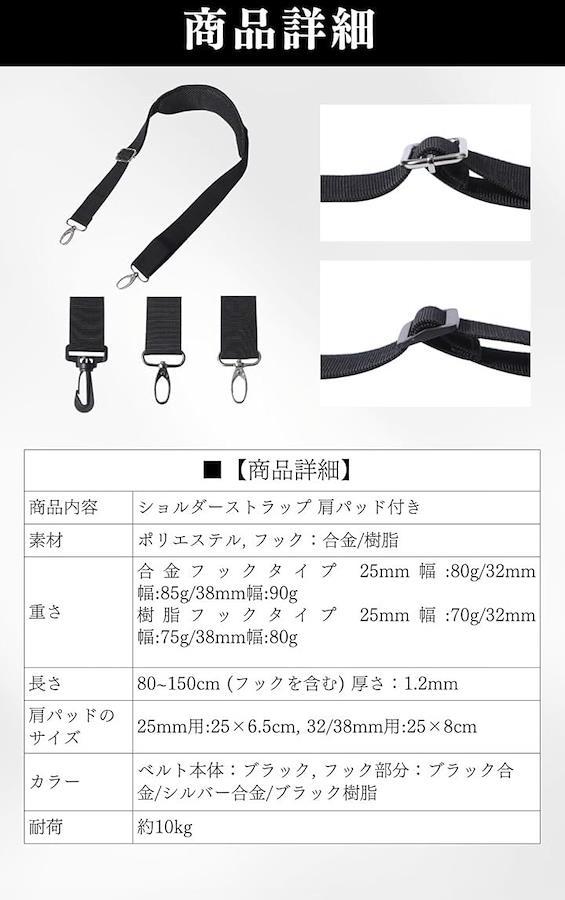 *「商品詳細」商品内容:ショルダーストラップ 肩パッド付き 素材 ベルト:ポリエステル, フック:合金/樹脂 ベルトのサイズ・重さ:合金フックタイプ 25mm幅:80g/32mm幅:85g/38mm幅:90g 樹脂フックタイプ 25mm幅:70g/32mm幅:75g/38mm幅:80g 長さ80~150cm (フックを含む) 厚さ:1.2mm 肩パッドのサイズ:25mm用:25x6.5cm, 32/38mm用:25x8cm カラー:ベルト本体:ブラック, フック部分:ブラック合金/シルバー合金/ブラック樹脂 耐荷: 約10kg 取り付けられるリングのサイズ:直径6mm以下のDリングなど