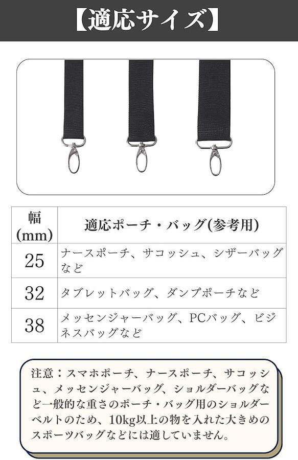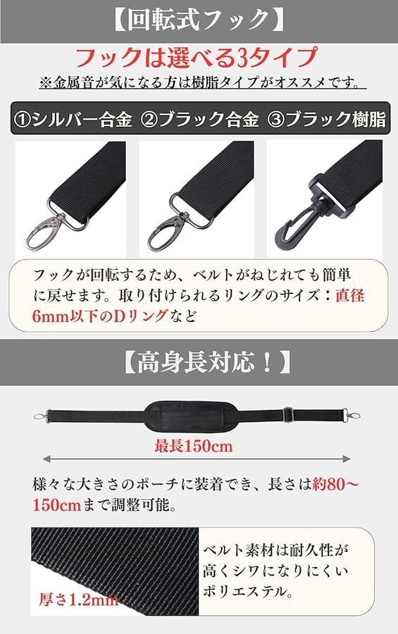 *注意*スマホポーチ、ナースポーチ、サコッシュ、シザーバッグ、メッセンジャーバッグ、ショルダーバッグなど一般的な重さのポーチ・バッグ用のショルダーベルトのため、10kg以上の物を入れた大きめのスポーツバッグなどには適していません。