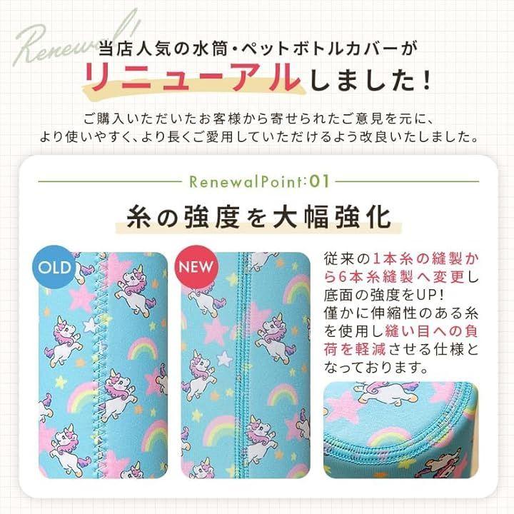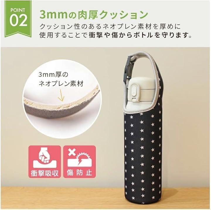 「伸縮素材でボトルにぴったりフィット」 ネオプレン素材を採用し、500~600mlのペットボトルや水筒にしっかりフィット。