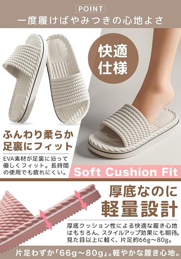 「一度履けばやみつきの心地よさ」柔らかく、ふんわりと足裏に沿って優しくフィットするEVA素材を採用。