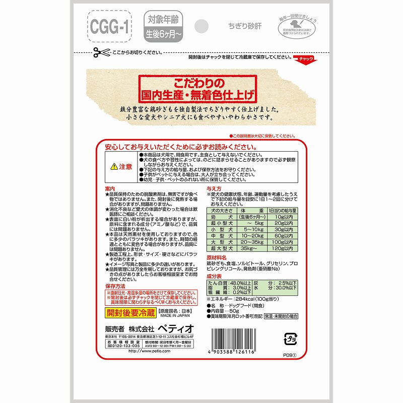 ・こだわりの国内生産・無着色仕上げ・低脂肪の砂ぎもを独自製法でちぎりやすく仕上げました。・小さな愛犬やシニア犬にも食べやすいやわらかさです。