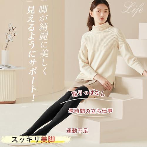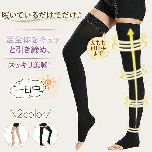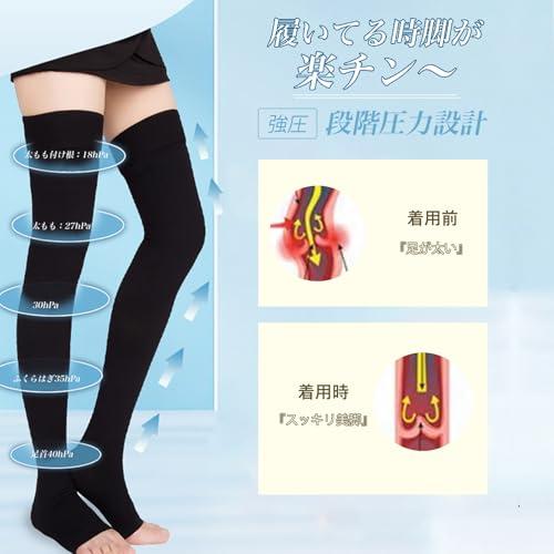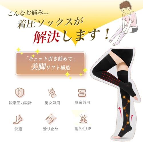 【段階圧力設計・男女兼用】日本人の体型データに基づくサイズ設計でより的確な圧迫圧を実現し、足首(40hPa)→ふくらはぎ(35hPa)→太もも(27hPa)→太もも付け根(18hPa)の圧迫圧で足首から上に向けて、幅の違う段階着圧設計をしているので、やさしく押し上げます。適度な段階着圧設計で、締めつけすぎないのでラクラク&快適なリラックスタイムを演出する着圧ソックス。着圧の黄金比率で足全体をバランスよくしめつける独自設計を採用し、立ち仕事だけでなく、出張や旅行、デスクワーク、冬場のブーツ着用時などにもおすすめで、男女兼用で使用できる弾性ストッキングです。【オープナー付き・心地よい引き締めですっきり美脚!】足指のアーチが整えられ、自然に開放するオープナーが付いており、足がリラックスした状態の自然な形状で設計されており、段階着圧によって引き締めながらも、心地よい着圧感があり、きつくない快適な履き心地。つま先が出るため、汗をかいても蒸れにくくサラッとした感触です。締めつける範囲がニーハイタイプにより狭いので、締めつけで気分が悪くなりやすい人でも使える着圧ソックスです。着圧ストッキングにはじめてチャレンジする人にはおすすめのハイソックスタイプです。【耐久性と着心地の良さを両立】普通の着圧ストッキングとは違い、複雑な編み目で破れにくい「ノンラン編み」と、糸同士をくっつけている「融着」があり、一般的な加圧ソックスよりも伝線しづらい長持ちしやすいです。伸縮性があり、縫い目もなし、チクチクやかゆみといった肌のストレスが軽減され、快適な着け心地感を実現!中には肌に優しい綿素材を配合し、蒸れにくい肌に優しいレッグカバーです。高純度超微粒子セラミックスを独自の技術により均一に繊維の中に練り込むことで、洗濯をしても着圧効果が持続します。【滑り止めシリコン付き・昼夜兼用】丈夫な素材で、つま先部分へ快適性を向上させるデザインを施すと共に、足底部に施されたリブ加工によりフィット感と耐久性が向上します。 幅広ゴムを採用し、ズレ落ちにくく、脚にも食い込みづらいので心地よく履けます。オープンフートタイプなので足が自由になり、圧迫感がなく、リラックスできますので日中はもちろん、就寝時に履くこともできます。膝上まである長いソックス状のニーハイタイプなので長さがあるので、スーツのスカートとも合わせられます。【着用方法】●ソックスをたぐりよせて、つま先を入れます。【普段着として使用可能】着圧レッグウェアをはくだけで脚を締め付けることでスッキリ感があり、脚が細く見える効果が期待できますので仕事中など普段使いしたい方におすすめです。特に調理師や美容師、教師、主婦、外科医、ナース、看護師、美髪師、営業員、販売員、警備員、建設業などの現場仕事に携わる人など長時間の立ち仕事や座りっぱなしの作業が多い方におすすめの弾性ソックスです。