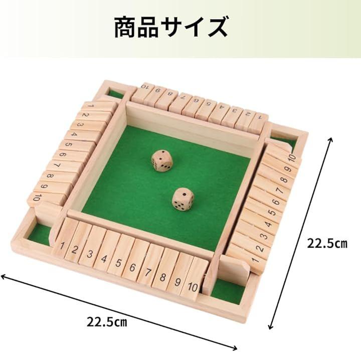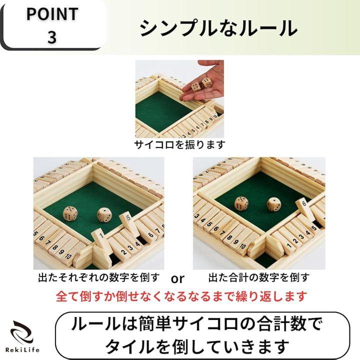 サイコロを2個振り、それぞれの出目や合計の数のタイルを倒していくだけの簡単なルール。
